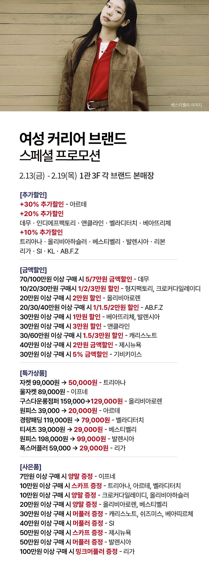 [여성 커리어 브랜드] 스페셜 프로모션 기간 : 2026-02-13 ~ 2026-02-19 위치 : 1관 3F 각 본매장 ▲ [여성 캐릭터 브랜드] 스페셜 프로모션 ▼ [패션잡화·제화·란제리] 스페셜 프로모션