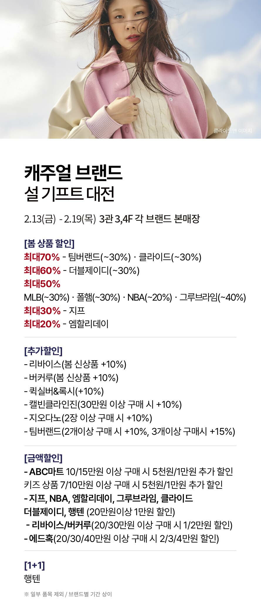 [캐주얼] 설 기프트 대전 기간 : 2026-02-13 ~ 각 브랜드 별 기간 상이 위치 : 3관 3, 4F 본매장 ▲ [캐주얼 브랜드] 설맞이 봄/여름 상품 특가전 ▼ [여성 영캐주얼 브랜드] 스페셜 프로모션