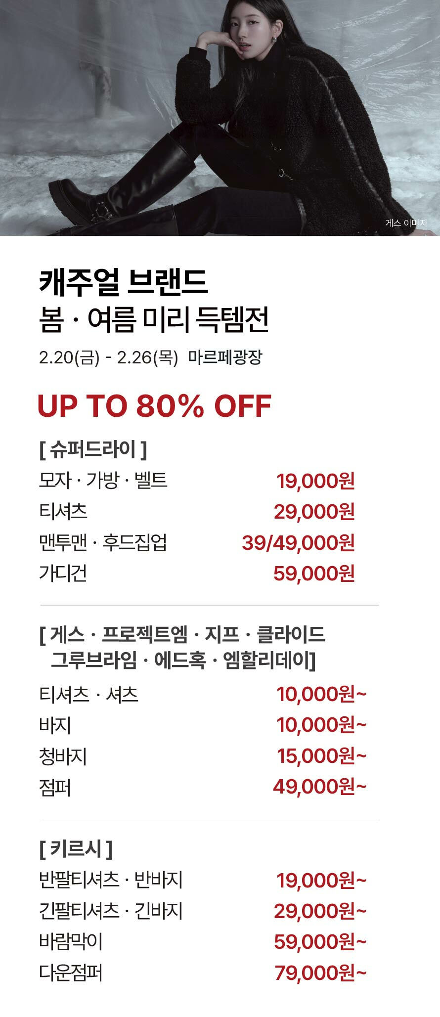 [캐주얼 브랜드] 봄/여름 미리 득템전 기간 : 2026-02-20 ~ 2026-02-26 위치 : 마르페광장 ▲ 3월 마리오게임빌리지연천 펜션 숙박권 당첨자 ▼ 대중교통 생활화 캠페인