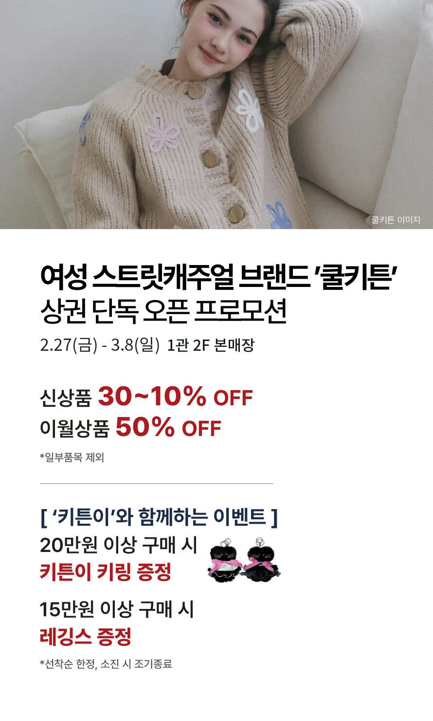 상권 단독 오픈 프로모션| NEW OPEN 여성 스트릿캐주얼 브랜드 <쿨키튼> 기간 : 2026-02-27 ~ 2026-03-08 위치 : 1관 2F 본매장 ▲ 3월 마리오게임빌리지연천 펜션 숙박권 당첨자 ▼ 대중교통 생활화 캠페인