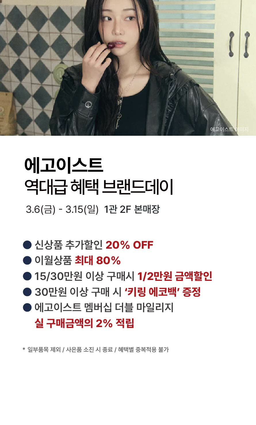 [에고이스트] 역대급 혜택 브랜드데이 기간 : 2026-03-05 ~ 2026-03-15 위치 : 1관 2F 본매장 ▲ 3월 마리오게임빌리지연천 펜션 숙박권 당첨자 ▼ 대중교통 생활화 캠페인