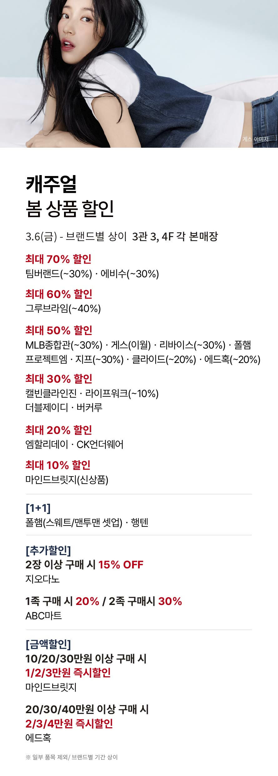 [캐주얼] 봄 상품 할인 기간 : 2026-03-06 ~ 각 브랜드 별 기간 상이 위치 : 3관 3·4F 각 본매장 ▲ 3월 마리오게임빌리지연천 펜션 숙박권 당첨자 ▼ 대중교통 생활화 캠페인