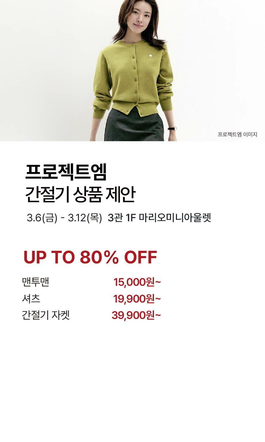 [프로젝트엠] 간절기 상품 제안 기간 : 2026-03-06 ~ 2026-03-12 위치 : 3관 1F 마리오미니아울렛 ▲ 3월 마리오게임빌리지연천 펜션 숙박권 당첨자 ▼ 대중교통 생활화 캠페인