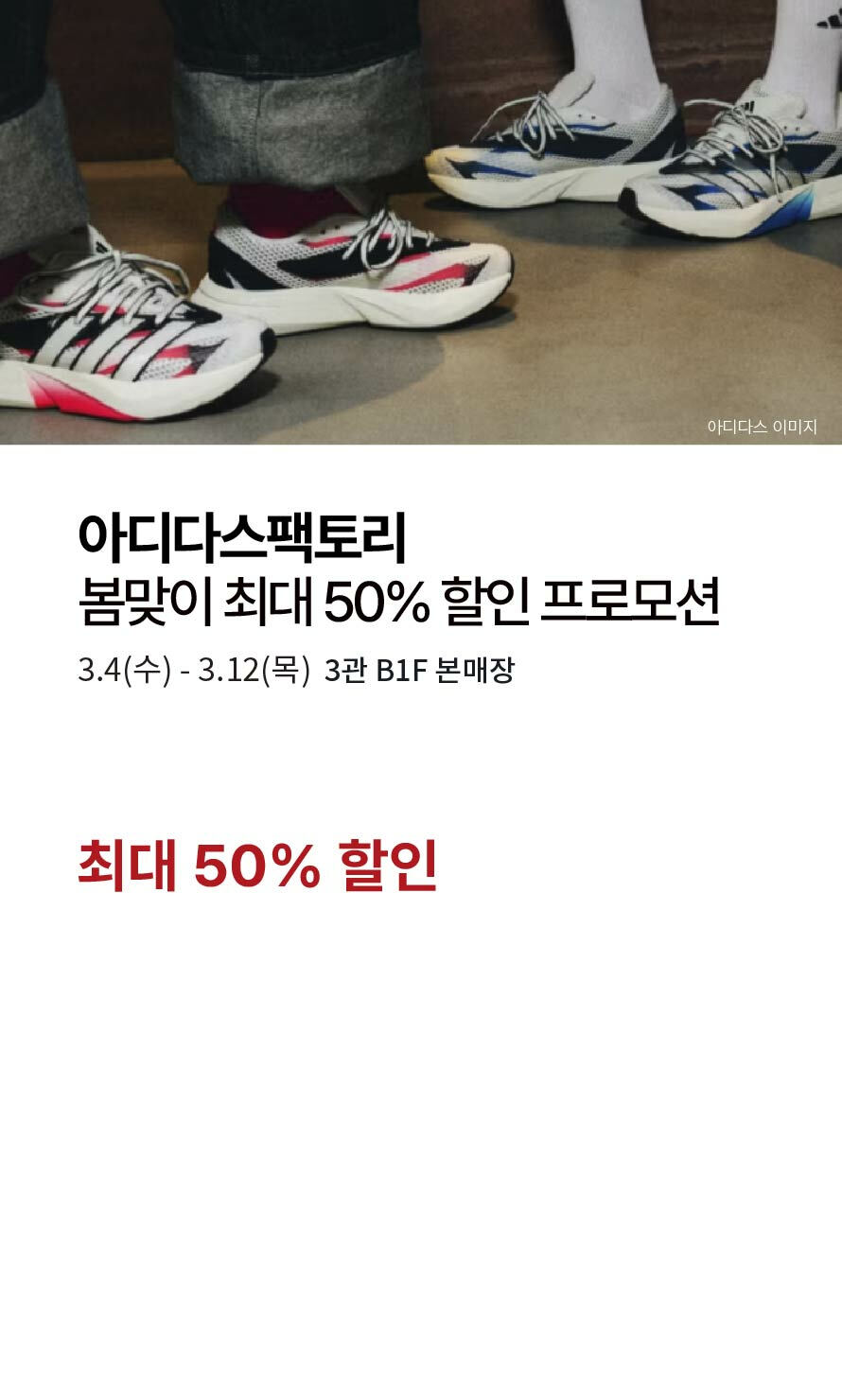 [아디다스 팩토리] 최대 50% 할인 프로모션 기간 : 2026-03-05 ~ 2026-03-12 위치 : 3관 B1F 본매장 ▲ 3월 마리오게임빌리지연천 펜션 숙박권 당첨자 ▼ 대중교통 생활화 캠페인