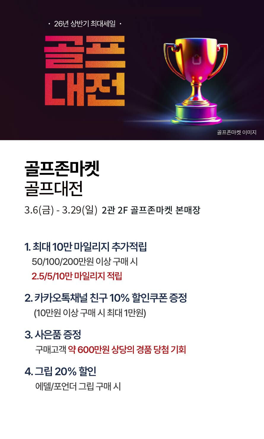 [골프존마켓] 골프대전 기간 : 2026-03-19 ~ 2026-03-26 위치 : 2관 2F 골프존마켓 본매장 ▲ [나이키골프·아디다스골프] 인기 골프의류/신발 입고 ▼ [STCO·소로지오·보스렌자] 인기 남성복 초특가 모음전