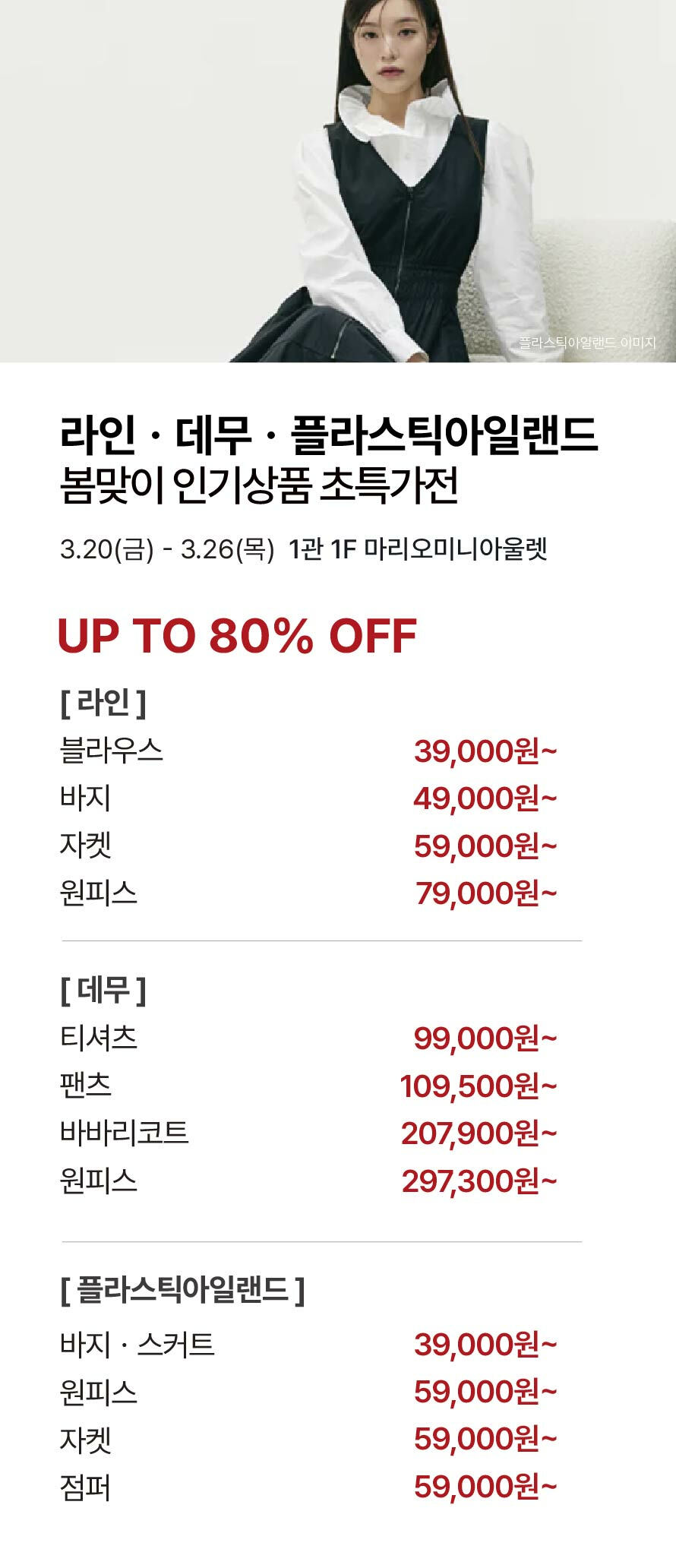 [라인·데무·플라스틱아일랜드] 봄맞이 인기상품 초특가전 기간 : 2026-03-19 ~ 2026-03-26 위치 : 1관 1F 마리오미니아울렛 ▲ [럭셔리부띠끄] 3월 특별가 인기아이템 추천 ▼ [나이키골프·아디다스골프] 인기 골프의류/신발 입고