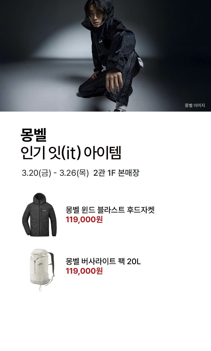 [몽벨] 인기 잇(it) 아이템 기간 : 2026-03-19 ~ 2026-03-26 위치 : 2관 1F 본매장 ▲ [벤제프] 신규오픈 기념 골프웨어 최대 85% ▼ [루이까스텔] 봄맞이 인기 골프웨어 특가전