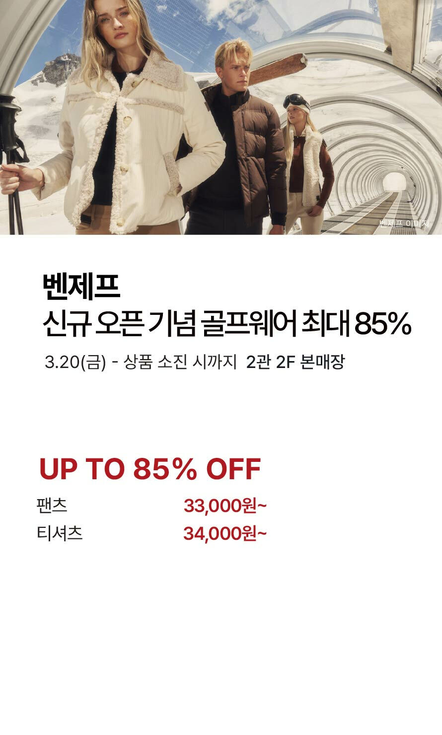[벤제프] 신규오픈 기념 골프웨어 최대 85% 기간 : 2026-03-19 ~ 2026-03-26 위치 : 2관 2F 본매장 ▲ [본·킨록by킨록앤더슨] 남성복 인기 브랜드 특별전 ▼ [몽벨] 인기 잇(it) 아이템