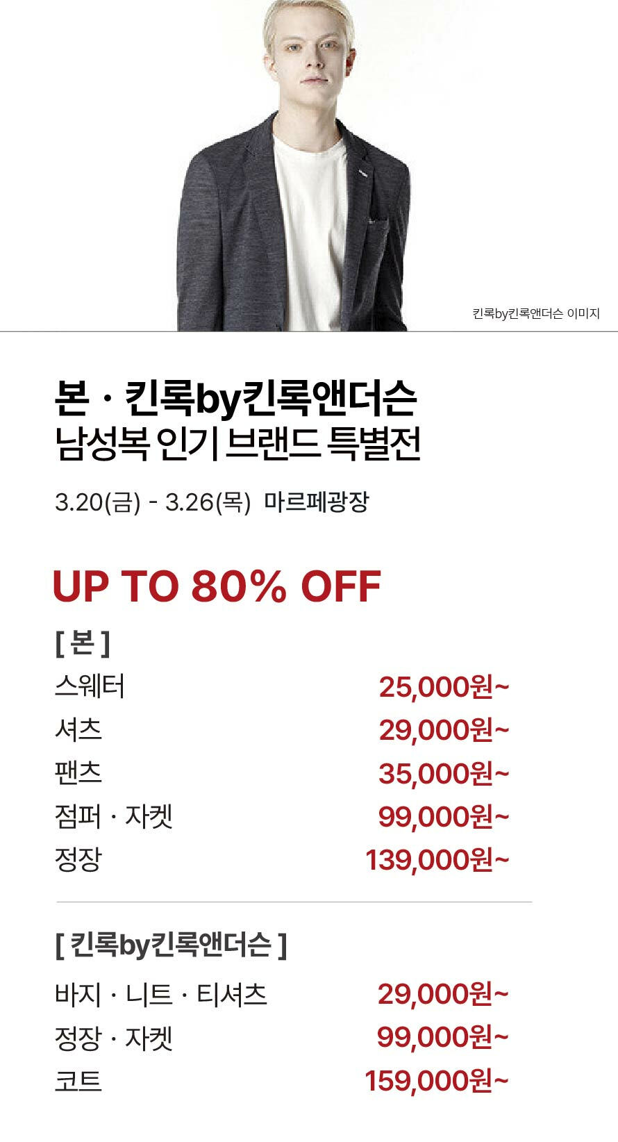 [본·킨록by킨록앤더슨] 남성복 인기 브랜드 특별전 기간 : 2026-03-19 ~ 2026-03-26 위치 : 마르페 광장 ▲ [아디다스 팩토리] 추가세일 ▼ [벤제프] 신규오픈 기념 골프웨어 최대 85%