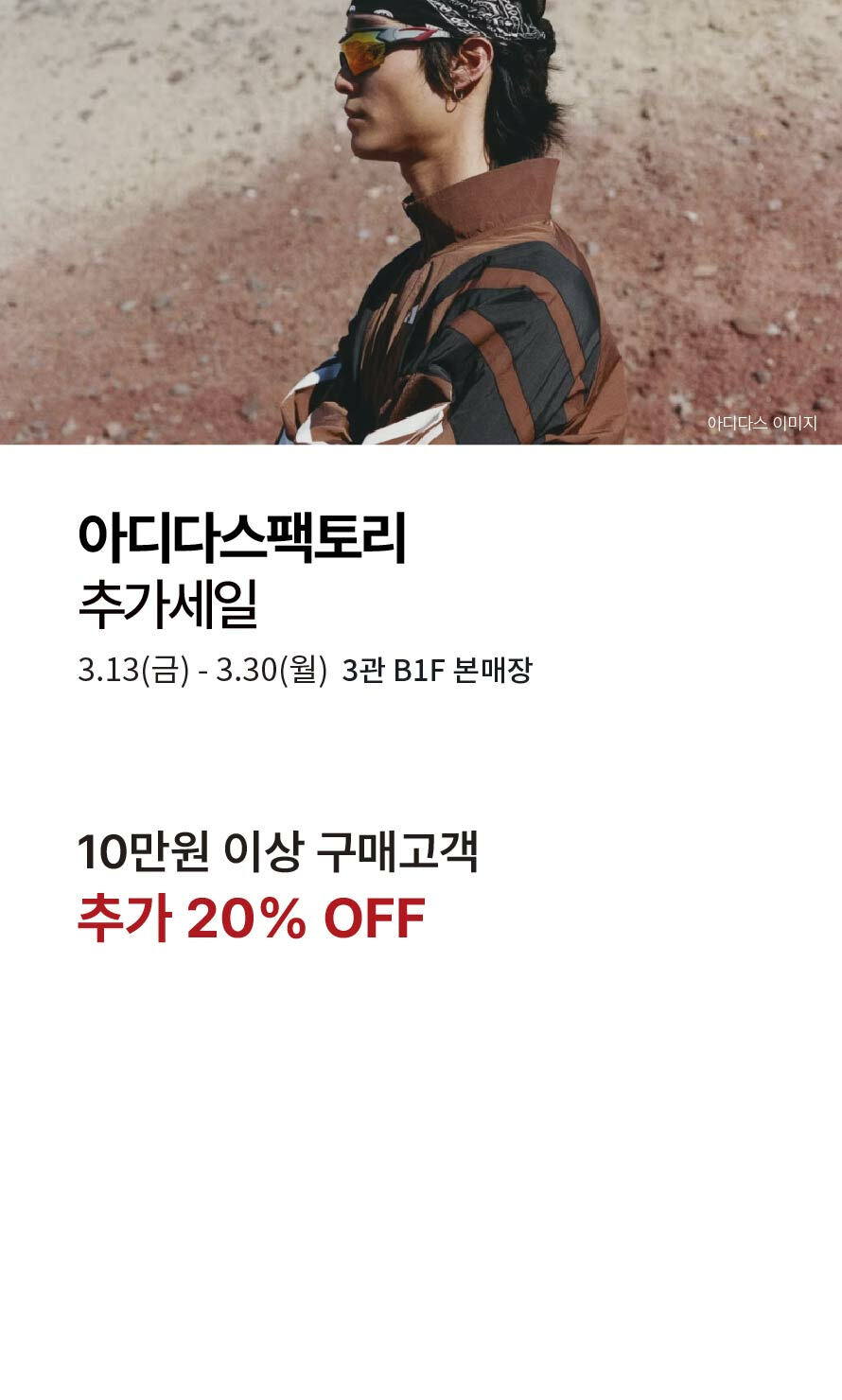 [아디다스 팩토리] 추가세일 기간 : 2026-03-19 ~ 2026-03-26 위치 : 3관 B1F 본매장 ▲ [에드혹] 간절기 상품 초특가전 ▼ [본·킨록by킨록앤더슨] 남성복 인기 브랜드 특별전
