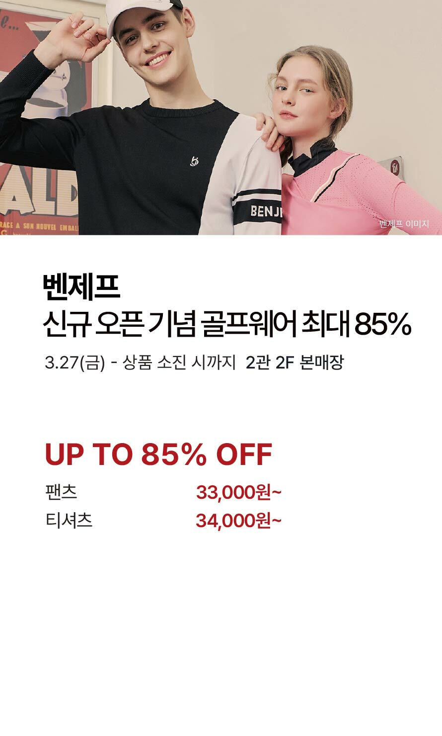 [벤제프] 신규오픈 기념 골프웨어 최대 85% 기간 : 2026-03-27 ~ 상품 소진시까지 위치 : 2관 2F 본매장 ▲ [나이키골프·아디다스골프] 인기 골프의류/신발 입고 ▼ [리틀밥독] 간절기 상품 초특가전