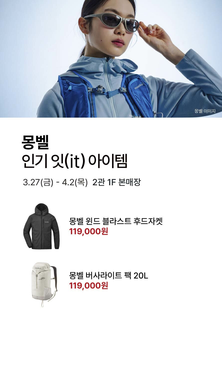 [몽벨] 인기 잇(it) 아이템 기간 : 2026-03-27 ~ 2026-04-02 위치 : 2관 1F 본매장 ▲ [킨록by킨록앤더슨·워모·파크랜드 종합관] 인기 남성복 브랜드 특별전 ▼ [나이키골프·아디다스골프] 인기 골프의류/신발 입고