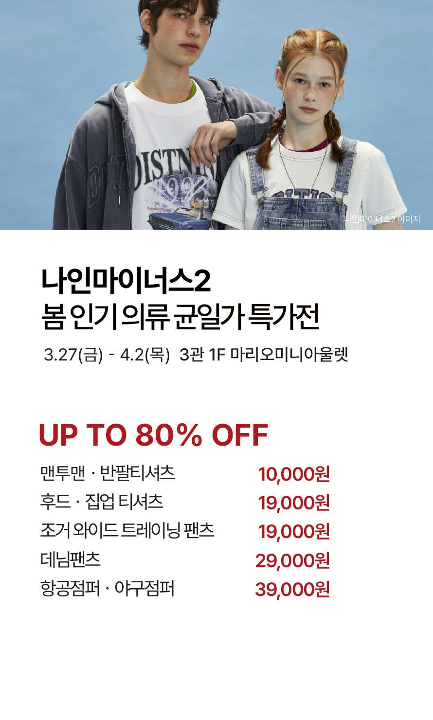 [나인마이너스2] 봄 인기 의류 균일가 특가전 기간 : 2026-03-27 ~ 2026-04-02 위치 : 3관 1F 마리오미니아울렛 ▲ [스파이더] 봄맞이 특가상품 제안전 ▼ [아디다스 팩토리] 추가세일 프로모션