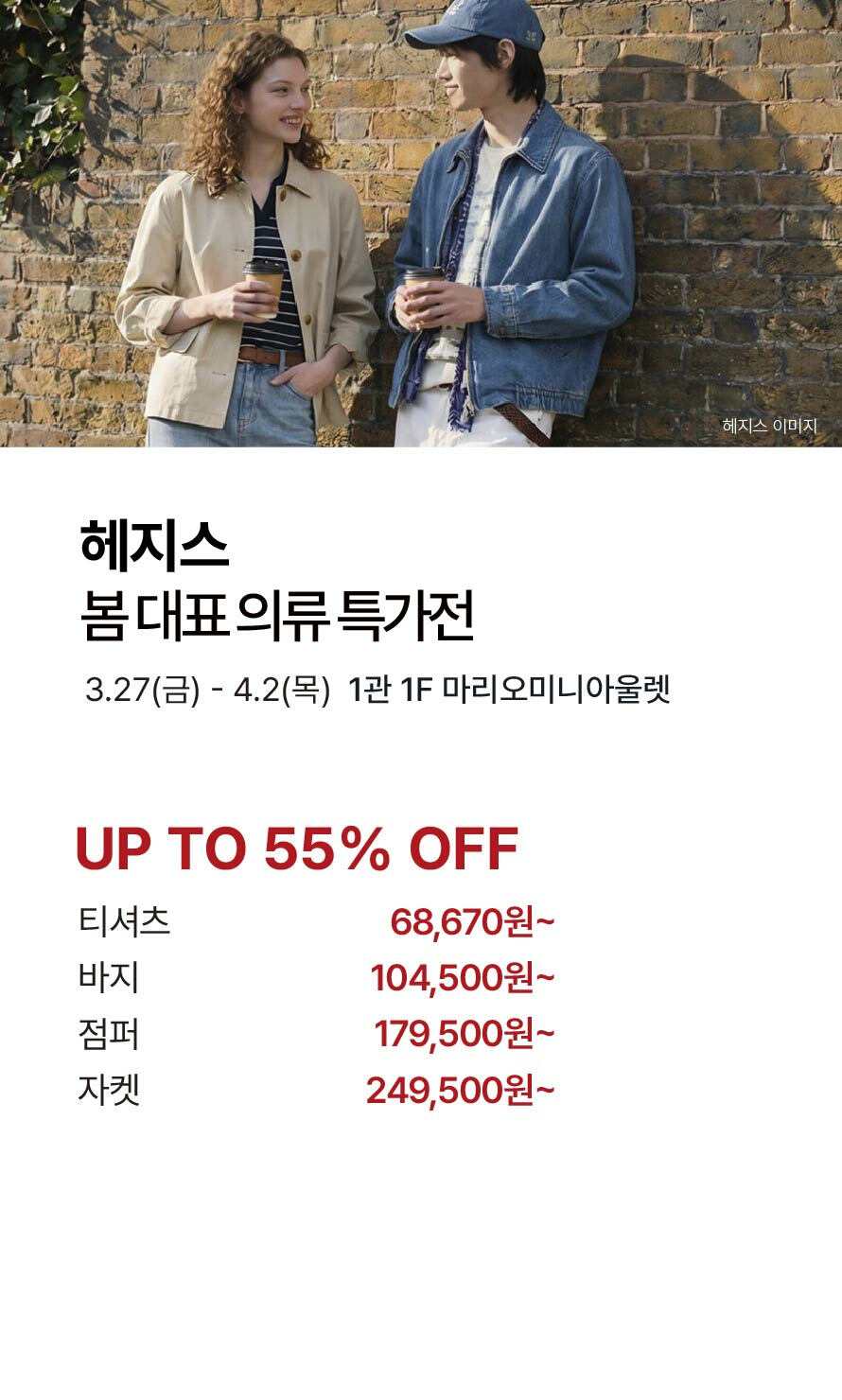[헤지스] 봄 대표 의류 특가전 기간 : 2026-03-27 ~ 2026-04-02 위치 : 1관 1F 마리오미니아울렛 ▲ [비지트인뉴욕·리스트] 여성 영캐주얼 대표브랜드 초특가전 ▼ [본·레노마정장] 남성 대표 브랜드 의류 할인전